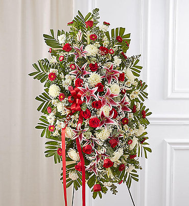 Filled with red roses and lily this funeral standing spray is a beautiful way to celebrate a life well lived filled with lots of love. Hand made at our flower shop with ruby red roses, radiant stargazer lily, white carnations and mums. This will express your condolences to your loved one.